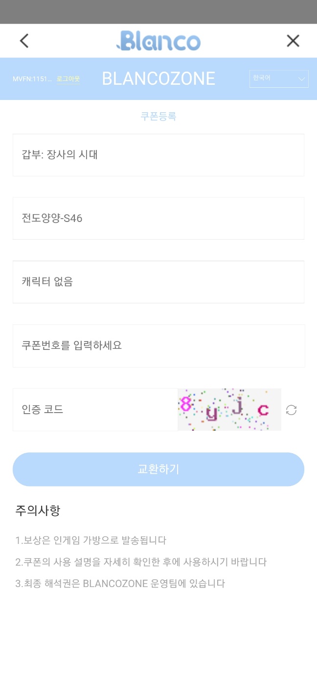 [서버], [캐릭터]를 선택하고 [쿠폰 번호]를 입력 합니다.