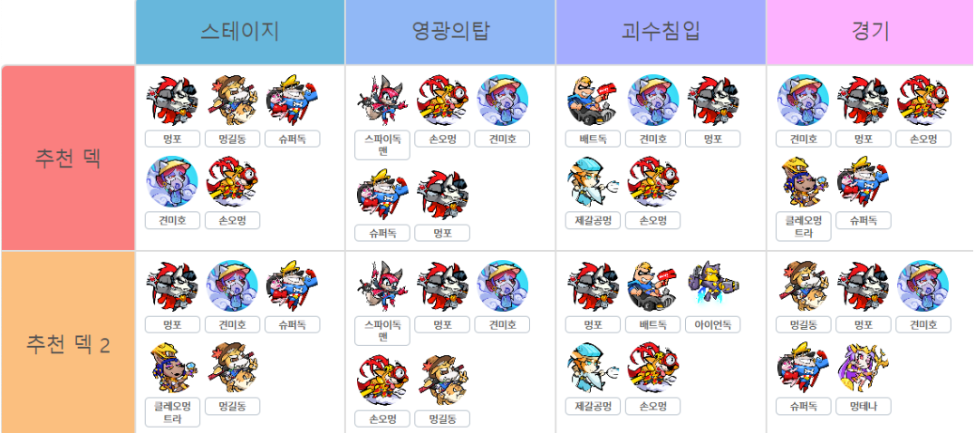 티어 캐릭터 1티어 멍길동, 멍포, 슈퍼독, 손오멍, 견미호 2티어 스파이독맨, 개사르, 클레오멍트라, 제갈공멍